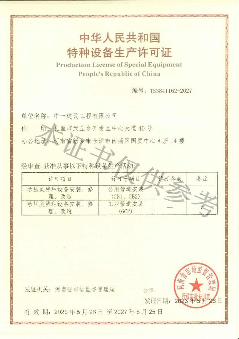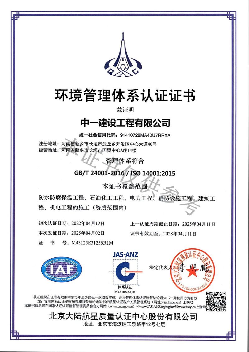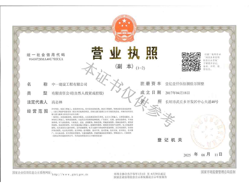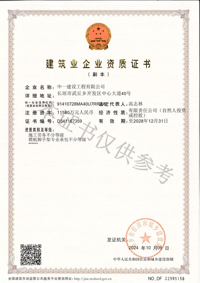 中一建設(shè)工程有限公司成立于2017年04月,公司辦公地址位于河南省長垣市國貿(mào)中心A座,公司現(xiàn)具有施工資質(zhì):防水防腐保溫工程承包壹級資質(zhì);消防設(shè)施工程承包壹級資質(zhì);建筑裝修裝飾工程承包壹級資質(zhì);建筑工程施工總承包貳級資質(zhì);電力工程施工總承包貳級資質(zhì);石油化工工程施工總承包貳級資質(zhì);市政公用工程施工總承包貳級資質(zhì);機電工程施工總承包貳級資質(zhì);地基基礎(chǔ)工程承包貳級資質(zhì);電子與智能化工程承包貳級資質(zhì);鋼結(jié)構(gòu)工程承包貳級資質(zhì);建筑幕墻工程承包貳級資質(zhì);環(huán)保工程承包貳級資質(zhì);壓力管道(GB1、GB2、GC2);施工勞務(wù)不分等級;模板腳手架承包不分等級;特種工程(結(jié)構(gòu)補強)不分等級。公司自成立以來一直奉行:“勇于開拓,真抓實干,銳意進(jìn)取,創(chuàng)造精品”的企業(yè)宗旨,始終堅持以市場為導(dǎo)向,以質(zhì)量為根本,以用戶滿意為標(biāo)準(zhǔn),努力實踐誠信為本的經(jīng)營理念。在激烈的建筑市場中積極進(jìn)取,取得了良好的經(jīng)濟(jì)效益和社會效益。